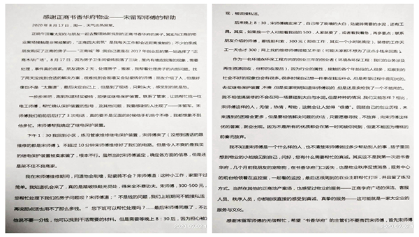 我不知道宋師傅在工作期間,服務(wù)過(guò)多少業(yè)主,無(wú)償幫助過(guò)多少人,但是我知道,這樣的品質(zhì)是他本有的。通過(guò)宋師傅,我想到了物業(yè)管家每天的微笑問(wèn)好,保潔大姐的辛勤付出,保安大哥每日的敬禮,他們都是一家好物業(yè)對(duì)業(yè)主的直接反饋。