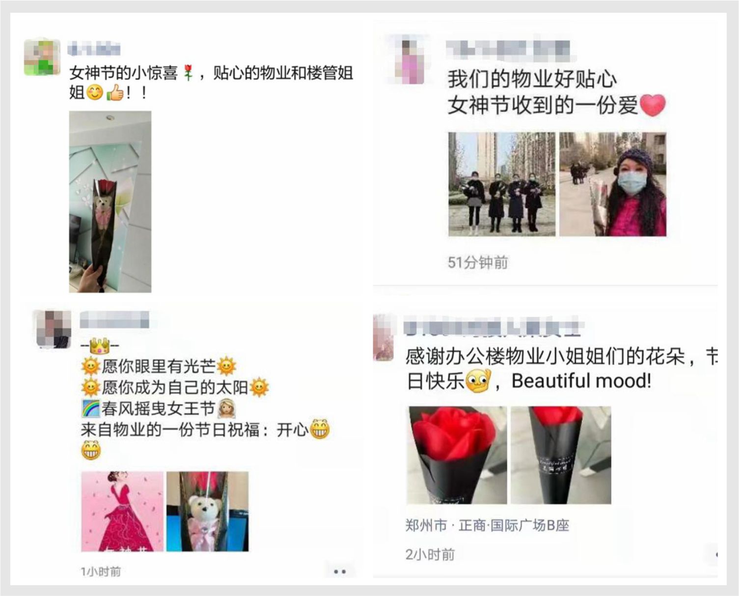 “您好,女神節(jié)快樂!”今早的你,從大堂走過,有沒有看到這一群笑容溫暖,抱著一大束鮮花送驚喜的物業(yè)工作人員呢?在大堂入口處,每一位經(jīng)過的“女神”都得到一支玫瑰。